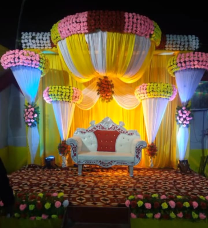 This image showcases a stunning royal wedding stage decoration designed with elegant drapes, colorful floral arrangements, and beautiful lighting πΈβ¨